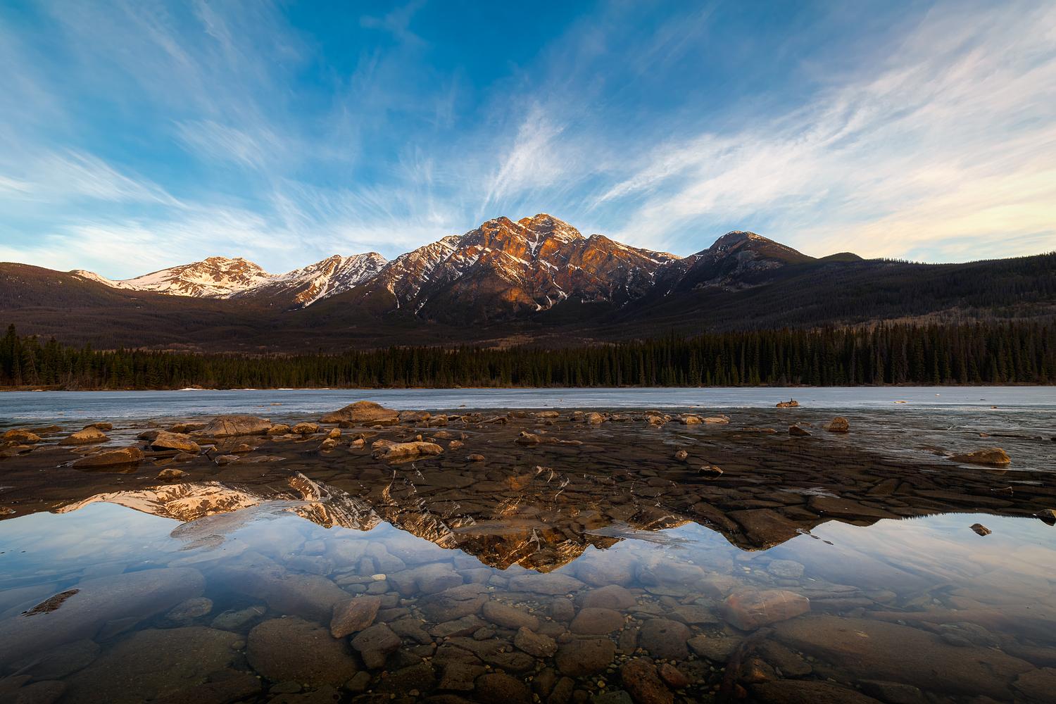 Reflection of Pyramid Mountain in Pyramid Lake in Jasper, AB.